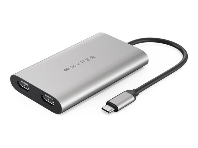 Tuotekuvaus HyperDrive Dual - näyttösovitin Kaapeli Näyttösovitin Enimmäislähtöresoluutio 4K - 60 Hz Liittimet 24 pin USB-C - uros (tulo) Liittimet (toinen pää) 2 x HDMI - naaras (lähtö)