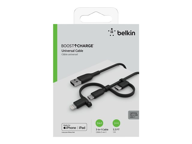 Tuotekuvaus Belkin BOOST CHARGE Universal - USB-kaapeli - Lightning / USB - 1 m Kaapeli USB-kaapeli - Lightning / USB Pituus 1 m Liittimet USB - uros Liittimet (toinen pää) Lightning - uros