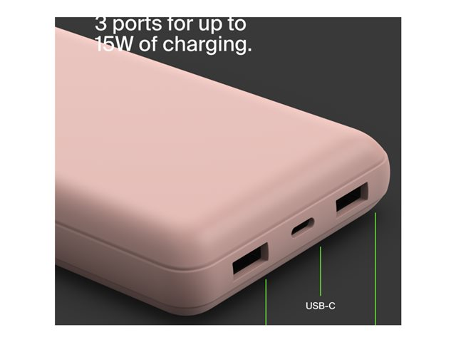 20000 mAh - 15 watti(a) - 3 A - 3 lähtöliittimet (24 pin USB-C, 2 x USB) - johdossa: USB-C - ruusukulta