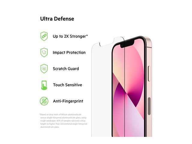 Tuotekuvaus Belkin ScreenForce UltraGlass - näytön suojus tuotteelle matkapuhelin - antimikrobinen Tuotteen tyyppi Näytön suojus - lasi Käyttötarkoitus: Matkapuhelin Suojaus Iskunsuojaus, sormenjälkikestävä, antimikrobinen, putoamisen kestävä, iskunkestävät Pakkaussisältö Puhdistusliina, näytönsuoja, pölynpoistotarra, Easy align tray Tuotemateriaali Karkaistu lasi (9H) Suunniteltu malleihin Apple iPhone 13 mini -