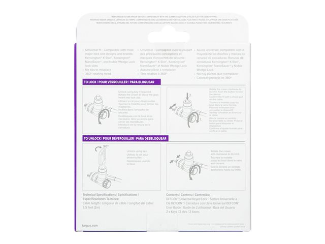 Tuotekuvaus Targus DEFCON Ultimate - turvakaapelilukko - yleisavaimellinen sovitettavalla lukkopäällä Tuotetyyppi Turvakaapelilukko - yleisavaimellinen sovitettavalla lukkopäällä Väri Hopea Tuotemateriaali Galvanoitu teräs Ulkomitat (PxSxK) 3.3 cm x 1.5 cm x 3.13 cm Pituus 2 m Paino 130 g Ominaisuudet 360 asteen päänkääntö, cut-resistant Valmistajan takuu 2 vuoden takuu -