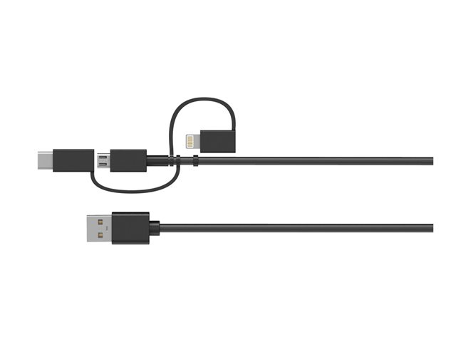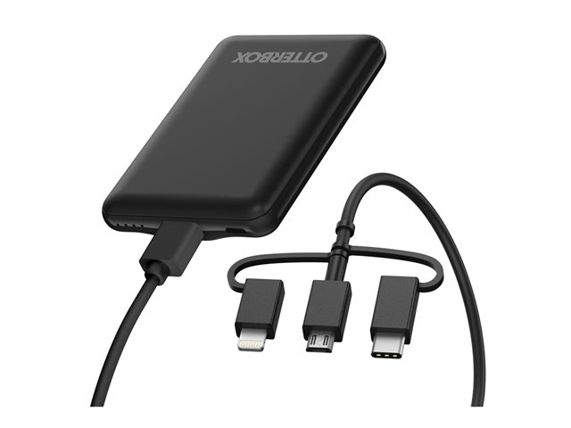 Virtapankki - 5000 mAh - 10.5 watti(a) - 2.1 A - Apple Fast Charge, FC (USB) - johdossa: Lightning/Micro-USB/USB-C - musta
