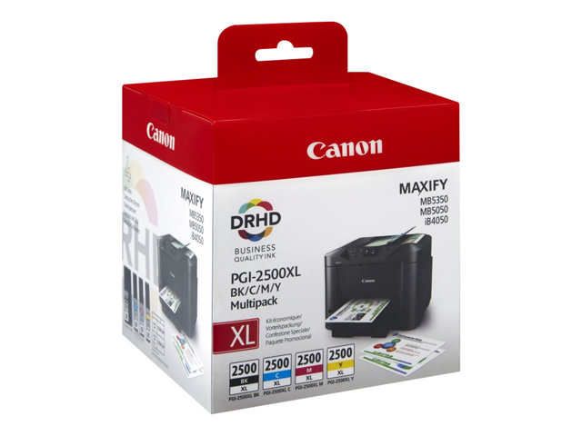Tuotekuvaus Canon PGI-2500XL C/M/Y/BK - 4 pakettia - musta, keltainen, sinivihreä, magenta - alkuperäinen - mustesäiliö Tuotteen tyyppi Mustesäiliö Tulostusteknologia Mustesuihku Tulostusväri Musta, keltainen, sinivihreä, magenta (pigmentoitu) Sisältyvä määrä 4 pakettia Yhteensopivuus: MAXIFY iB4050, iB4150, MB5050, MB5150, MB5155, MB5350, MB5450, MB5455 -