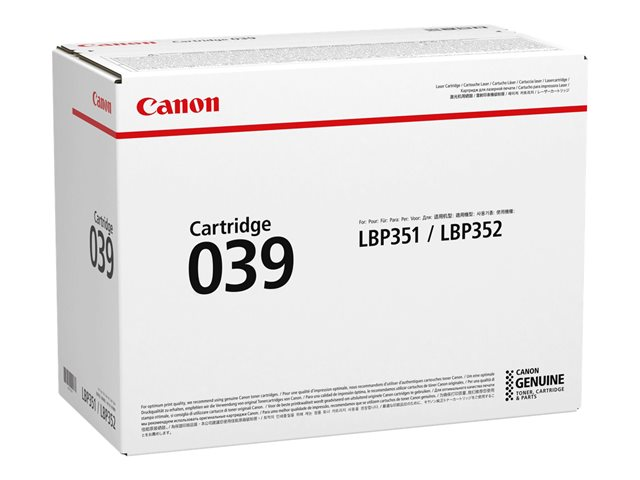 Tuotekuvaus Canon 039 - musta - alkuperäinen - väriainekasetti Tuotteen tyyppi Väriainekasetti Tulostusteknologia Laser Tulostusväri Musta Tuotto Jopa 11 000 sivua Yhteensopivuus: imageCLASS LBP351dn, LBP351x, LBP352dn, LBP352x; i-SENSYS LBP351x, LBP352x; Satera LBP351i -