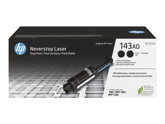 Tuotekuvaus HP 143AD - 2 pakettia - musta - väriainetäyte Tuotteen tyyppi Väriainetäyte Tulostusteknologia Laser Tulostusväri Musta Tuotto Jopa 2 500 sivua ISO/IEC 19752 Sisältyvä määrä 2 pakettia Yhteensopivuus: Neverstop 1001nw, 1001nw Cartridge-Free Laser Tank, 1202nw Cartridge-Free Laser Tank, 1202w Cartridge-Free Laser Tank; Neverstop Laser 1000a, 1000n, 1000w, MFP 1200a, MFP 1200n, MFP 1200nw, MFP 1200w, MFP 1201n, MFP 1202nw -